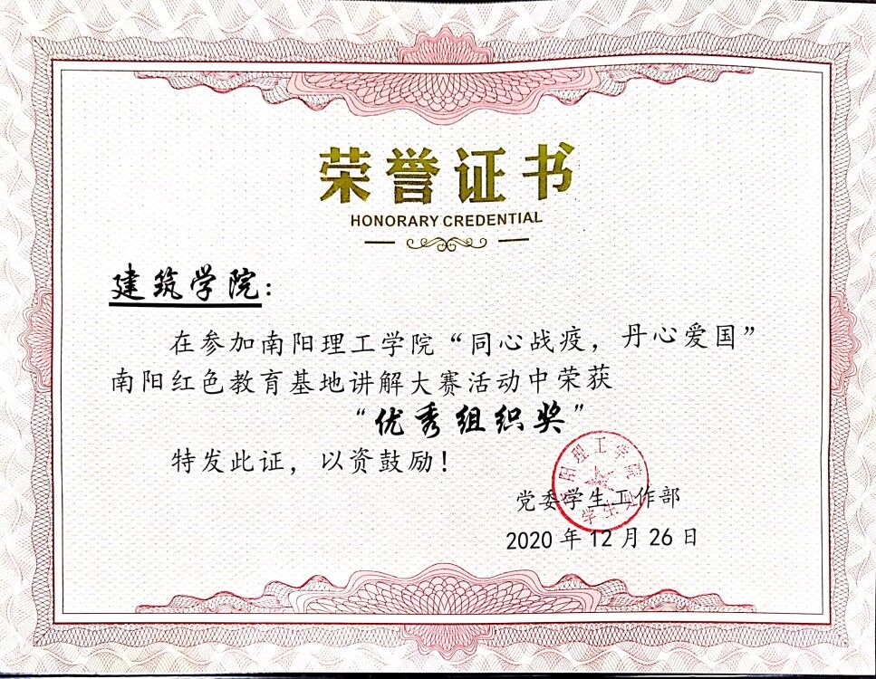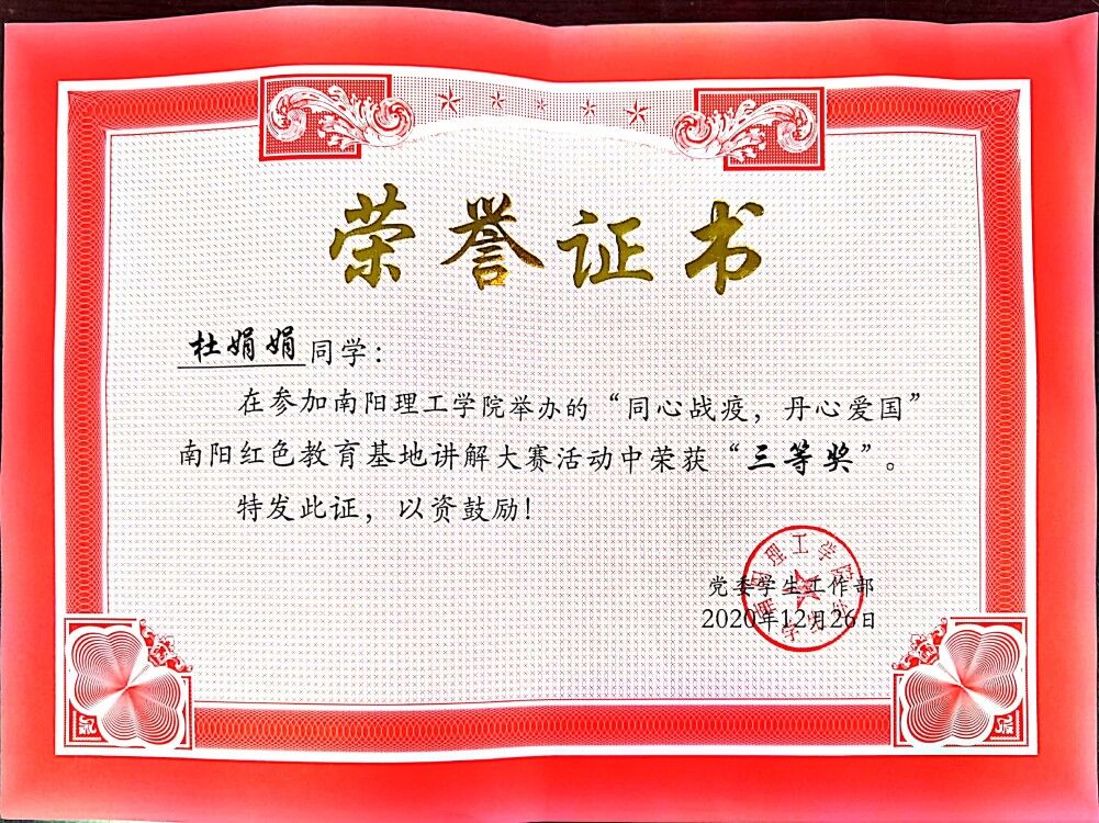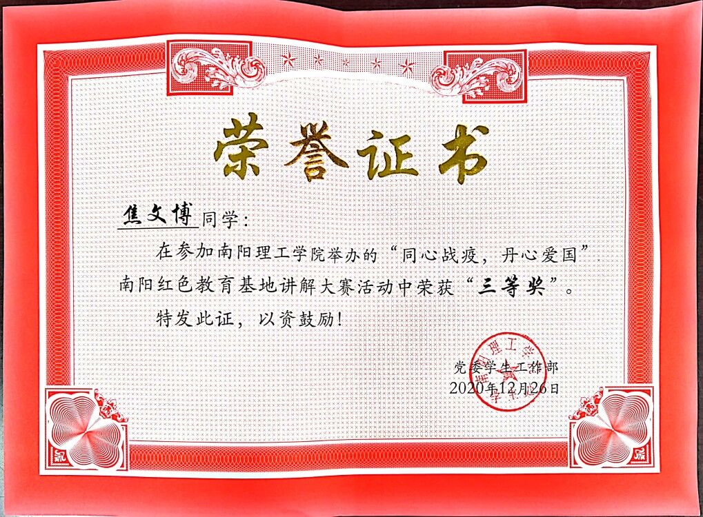 南阳理工学院“同心战疫,丹心爱国”讲解大赛获奖证书